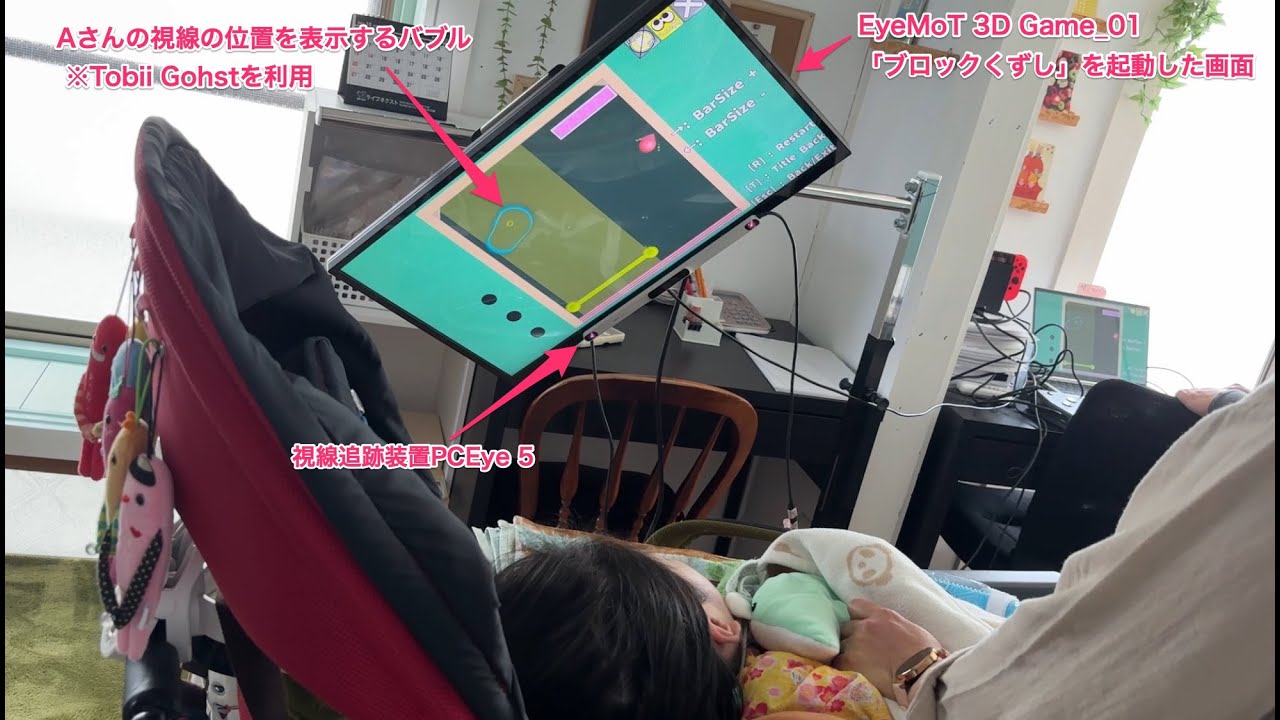 241029TAさん-視線追跡装置PCEye 5とWindowsアプリEyeMoT 3D Game 01「ブロックくずし」を利用して視線入力で遊ぶ20241031_#0938 教材活用動画 X Facebook はてブ LINE コピー 2024.10.31 この記事は約1分で読めます。 241029TAさん-視線追跡装置PCEye 5とWindowsアプリEyeMoT 3D Game 01「ブロックくずし」を利用して視線入力で遊ぶ20241031_#0938肢体不自由のある19歳のTAさんが島根大学総合理工学研究科の伊藤史人研究室 で無償提供されている重度障害児・者支援アプリ EyeMoT 3D Game_01「ブロックくずし」