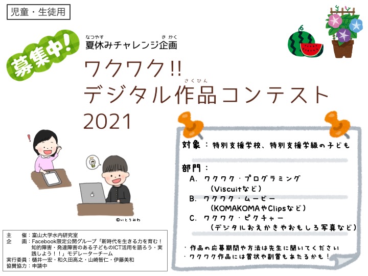 富山大学の水内豊和准教授が中心となり、特別支援学校、特別支援学級に在籍する児童・生徒を対象としたデジタル作品コンテストが行われる。 作品は9月30日まで募集する。「プログラミング」「動画」「静止画