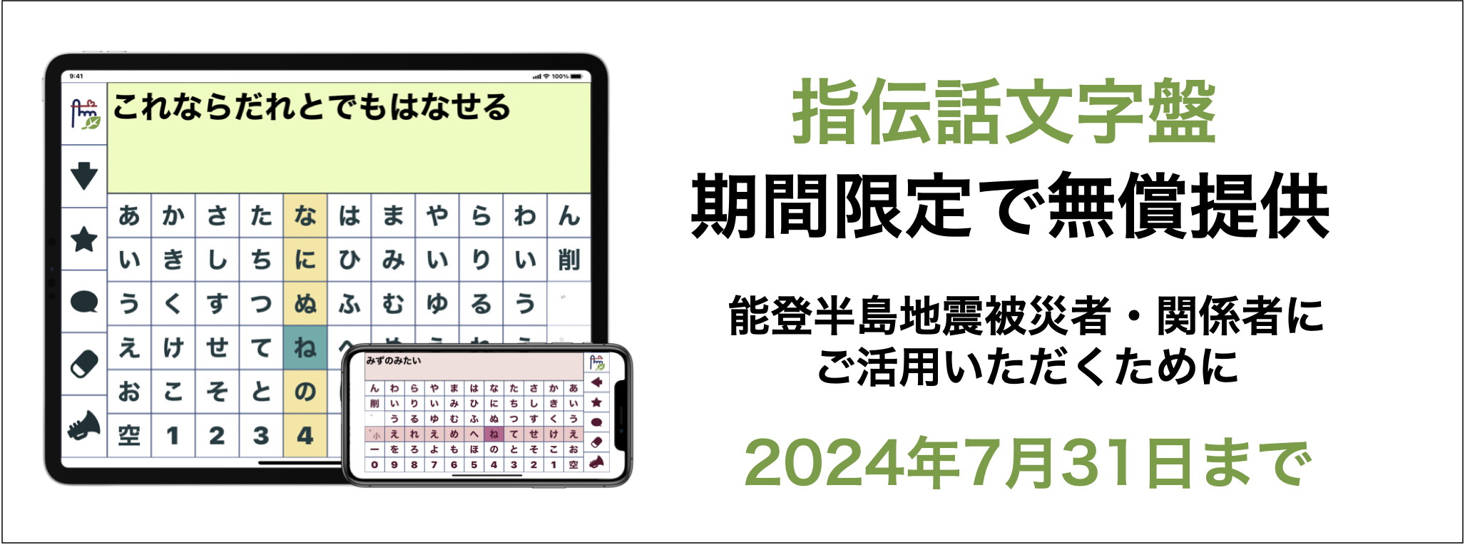 指伝話で有名な有限会社オフィス結アジアが能登半島地震で被害に遭われた方の支援のため、指伝話文字盤を期間限定で無料提供すると教えてもらいました。