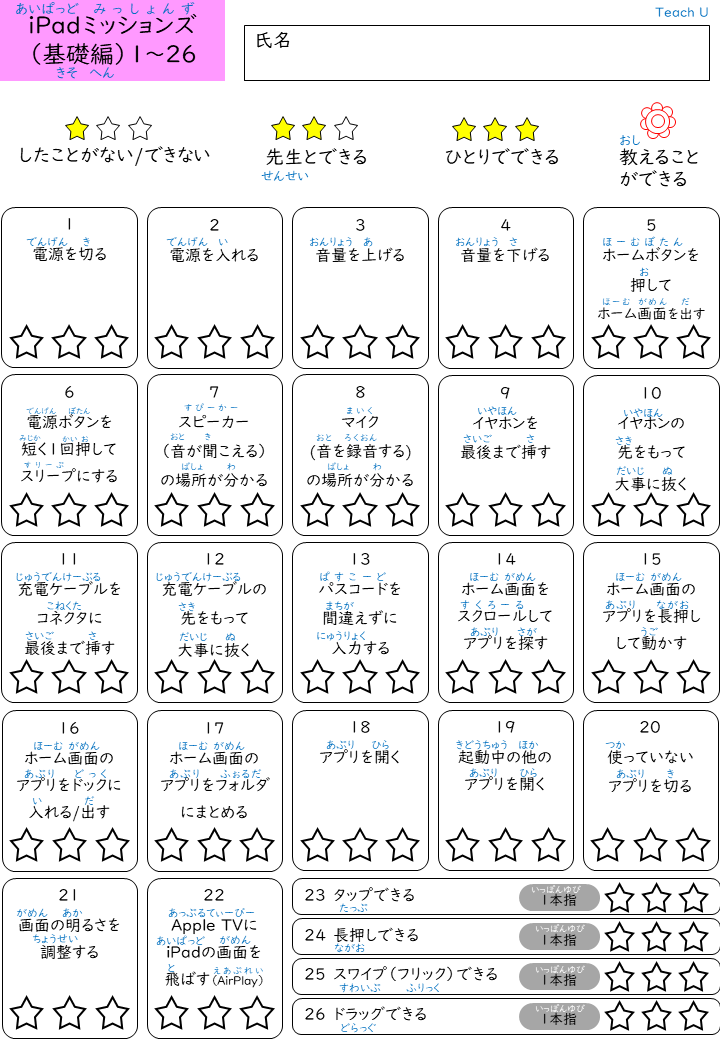 高等部1段階想定。iPadを使う上で必要な操作方法を知り,基本的な操作スキルを高めるための小さなミッションを集めました。(Chromebook版はこちら↓)1分動画(視聴したい番号を押してください。YouTube動画が始まります。)1~26...