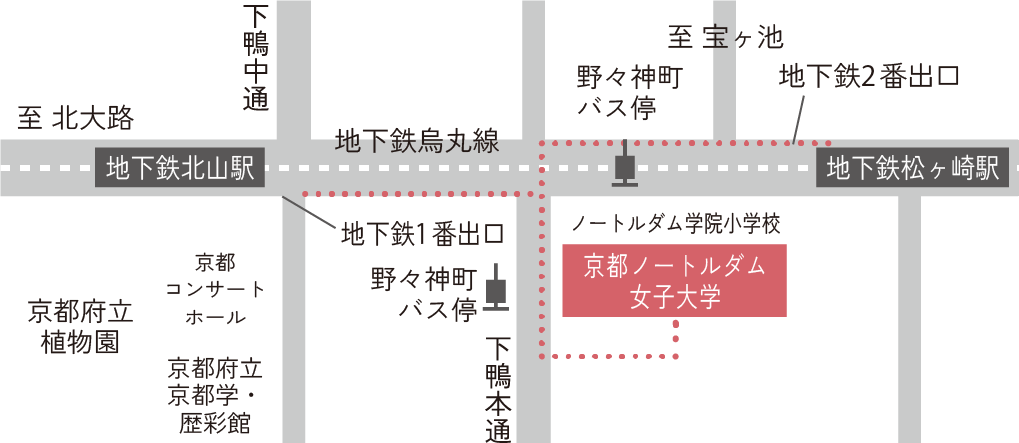 所在地 京都ノートルダム女子大学 〒606-0847 京都市左京区下鴨南野々神町1番地 交通アクセス JRをご利用の方 JR「京都駅」から(地下鉄乗車時間15分)地下鉄烏丸線「国際会館」行き乗車→「北山駅」下車、1番出口