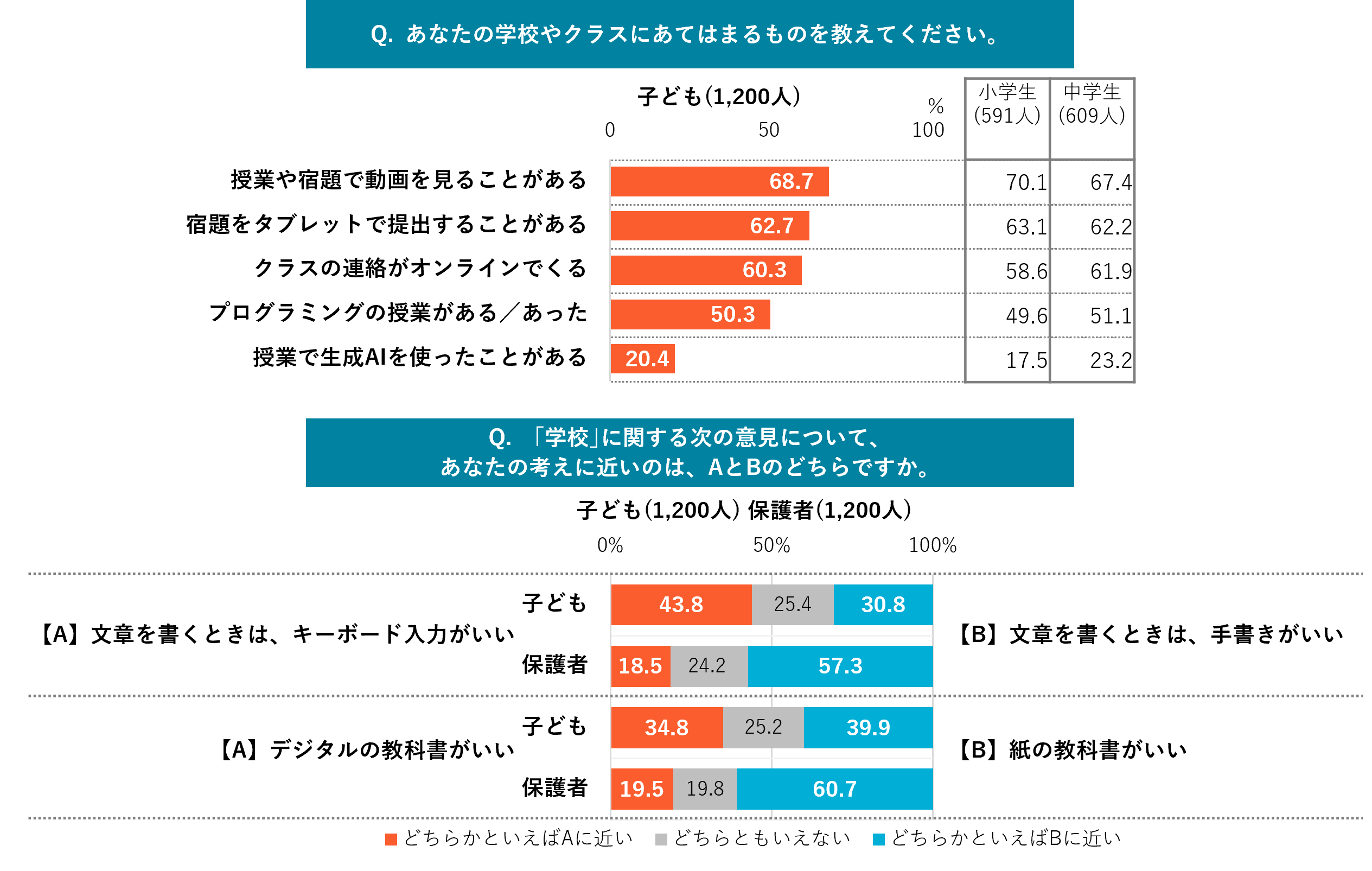 面白いのは保護者は文字を書くときには手書きがいいと答えている数が多いのに子どもはキーボードの方が数字が高いことです。