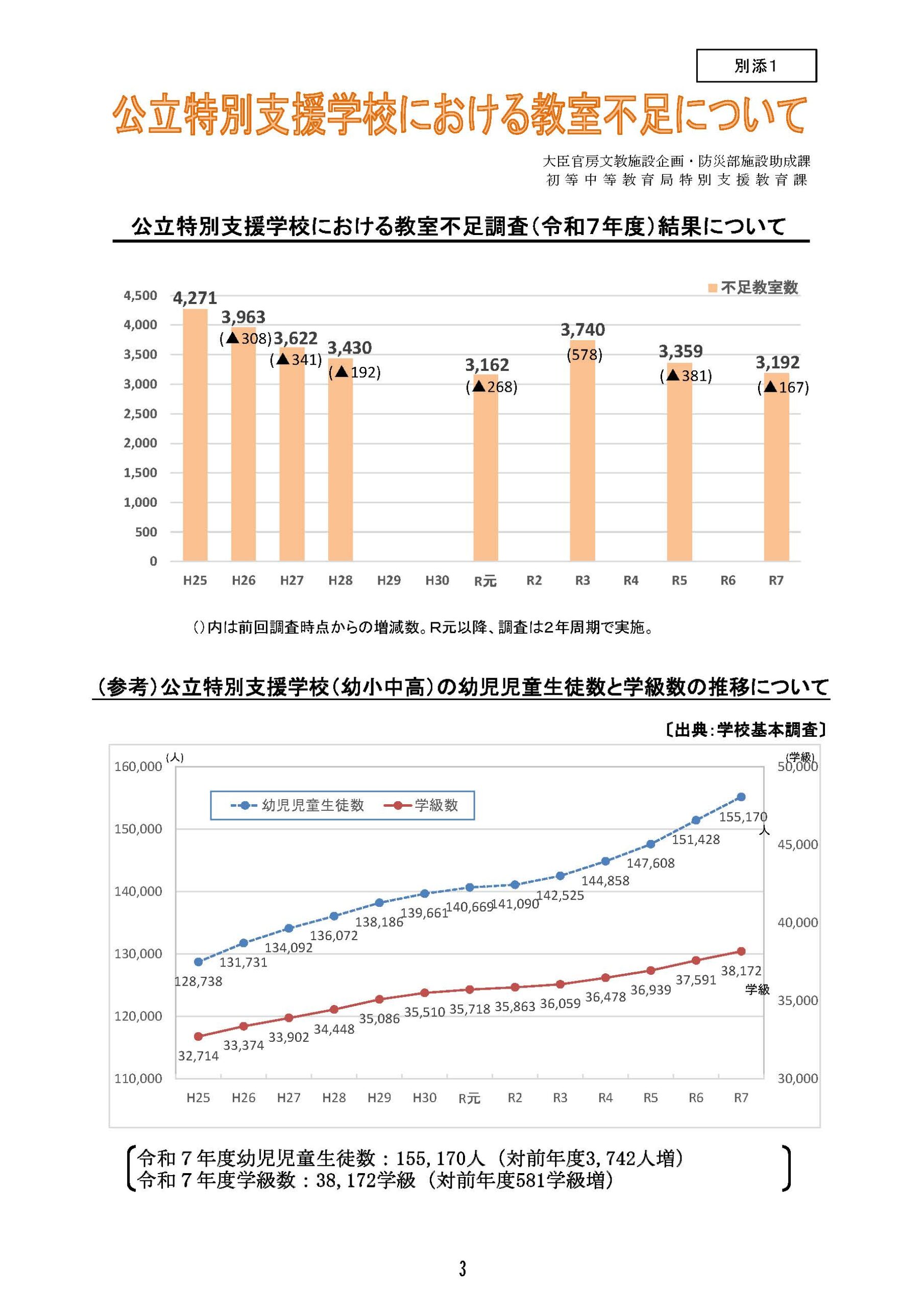 令和7年10月1日現在における公立特別支援学校の教室不足の状況等を調査したと ころ、45都道府県で3,192教室の不足が生じている。前回調査(令和5年10月 1日時点)と比較して、167教室減少している。